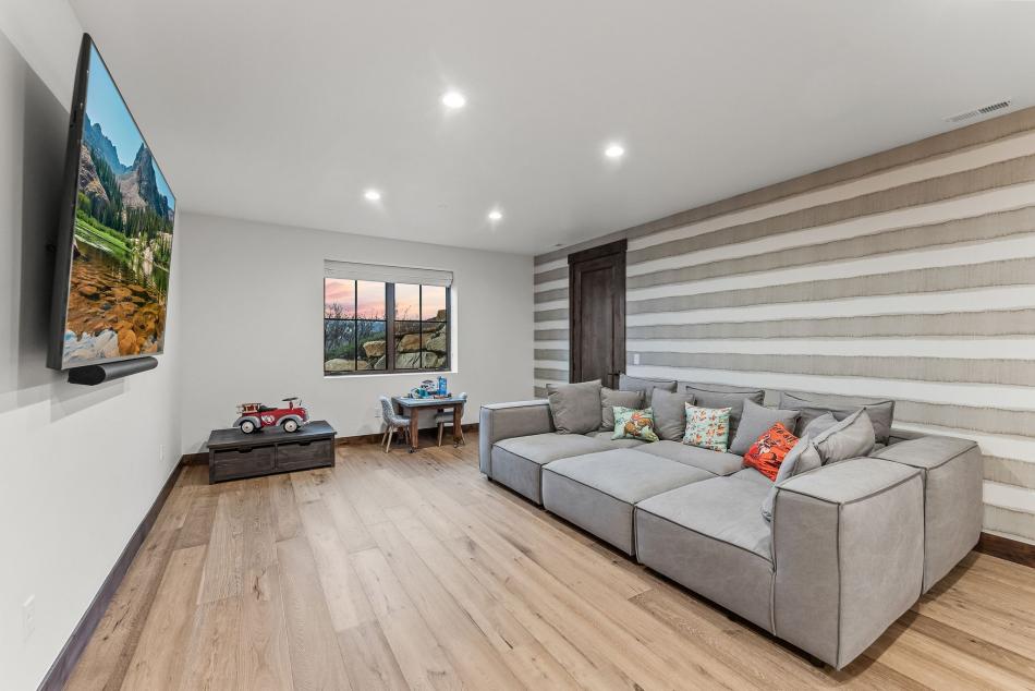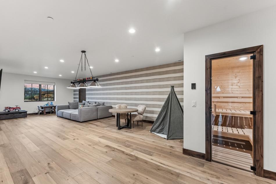 - Lower Level: 3 Bedrooms (1 En-suite), Shared bath, Family Room, Game Room with Sauna, and Powder Room